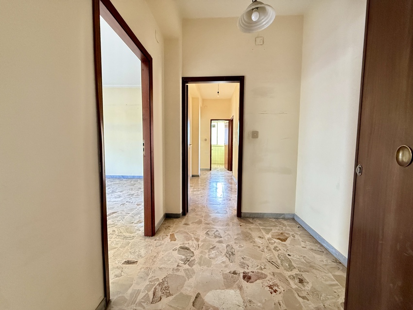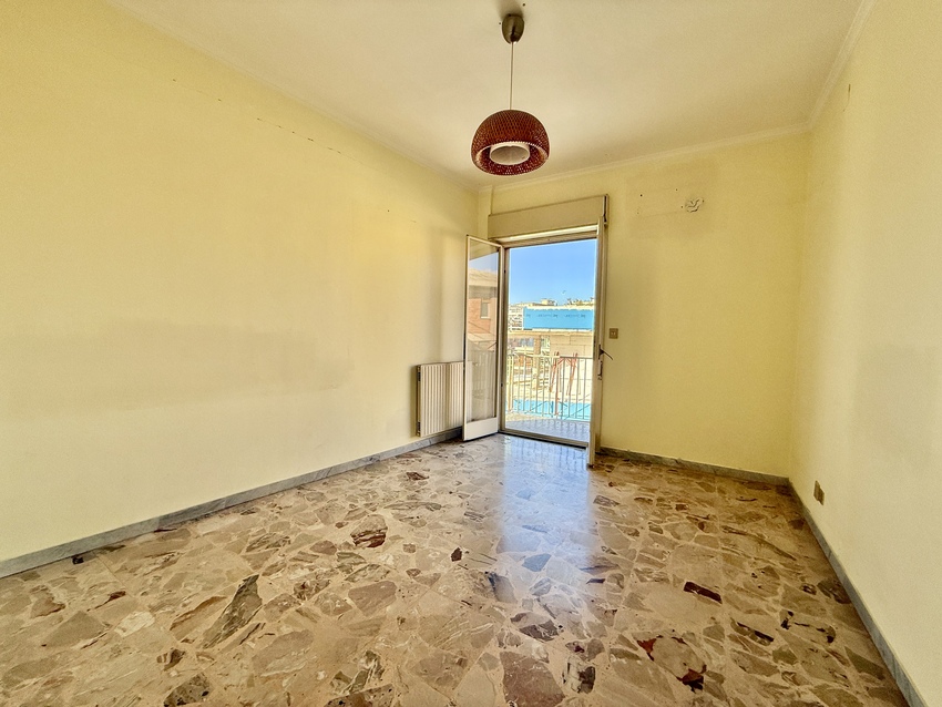 L’ingresso si apre su una saletta che conduce al salone doppio, con affaccio su balcone con vista mare. Un corridoio disimpegna la cucina abitabile, con uscita su un balcone terrazzato esposto ad ovest, le due camere da letto, il bagno con vasca e una lavanderia interna con servizio igienico.