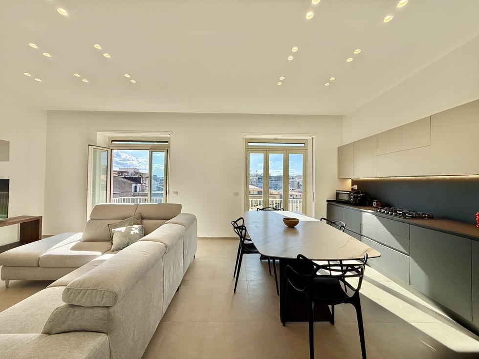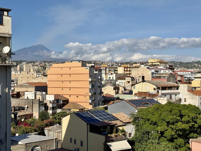 L’ingresso si apre su un elegante e luminoso living con cucina a vista, caratterizzato da un unico grande ambiente e da due aperture che si affacciano su un balcone esposto a ovest. Un corridoio conduce alla cameretta, dotata di balcone rivolto ad est con splendida vista sull’Etna; su questo balcone è presente una comoda lavanderia. La zona notte è completata da due bagni moderni e ben rifiniti, entrambi con doccia, una seconda camera da letto e un’ulteriore camera matrimoniale. Sono inoltre stati ricavati comodi spazi con armadi a muro, tra cui un pratico vano ripostiglio con alloggio per lavatrice.